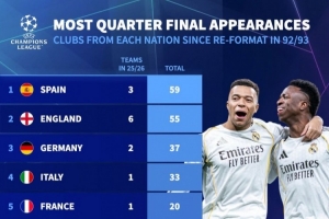 92-93赛季以来晋级欧冠8强次数:西班牙球队59次最多,英格兰55次
